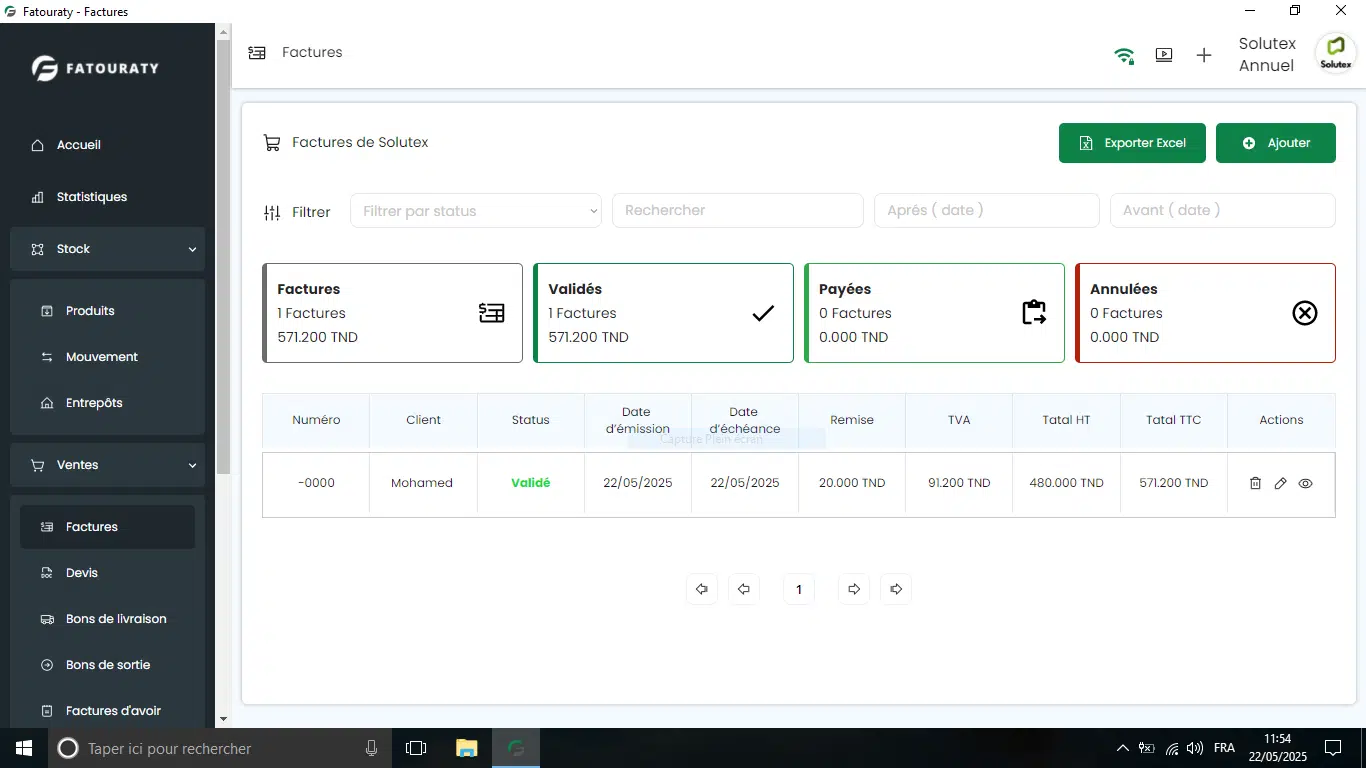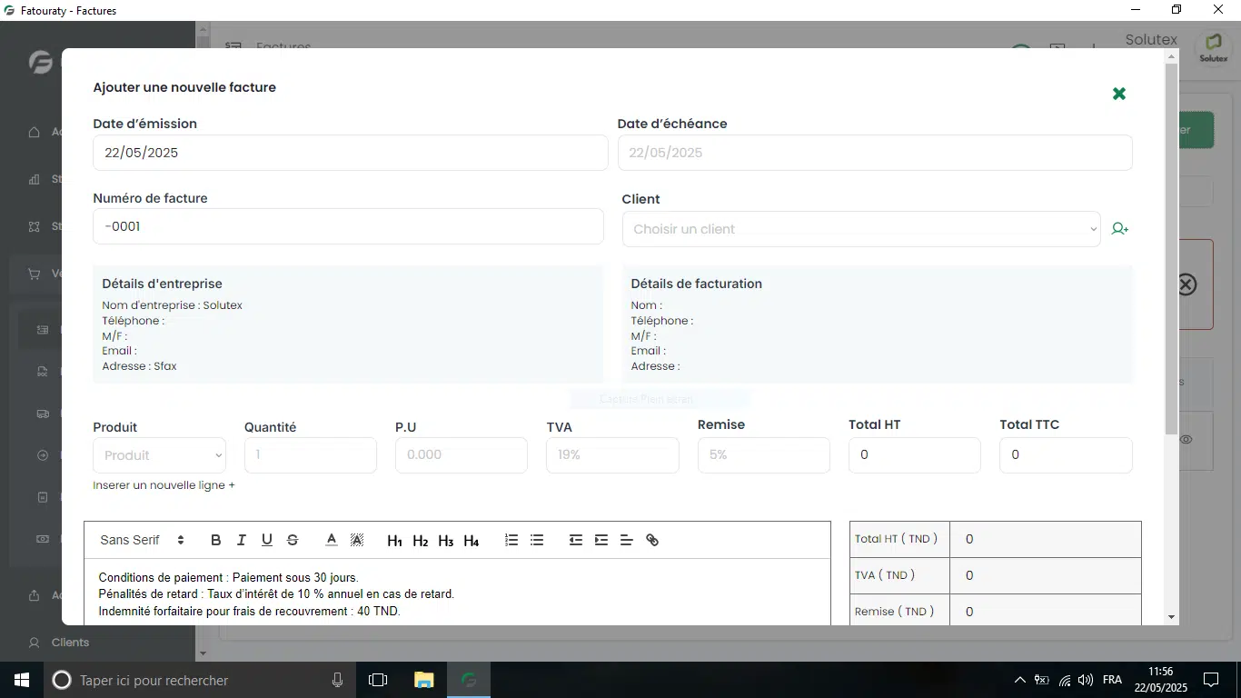 Développé par Solutex, Fatouraty est un logiciel de facturation complet conçu pour moderniser la gestion commerciale des entreprises. Pensé pour être performant et intuitif, il s'installe localement sur vos équipements tout en exploitant la puissance d’Internet pour offrir une expérience fluide et connectée.